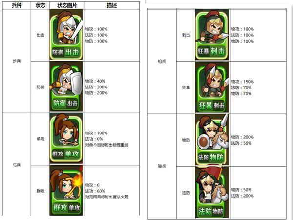 步兵在前排,能够切换出击和防守两种状态,保卫后边的脆皮主公;弓兵能够单攻和群攻,群攻相当于集火,能够集中火力逐个击破。枪兵的两个状态分别是刺击和狂暴,狂暴期间攻击值会增加一倍,但防御力都会下降。最后一个是状态很特殊的骑兵,切换状态能够切换自己的防御属性,能在关键时候发挥关键作用。