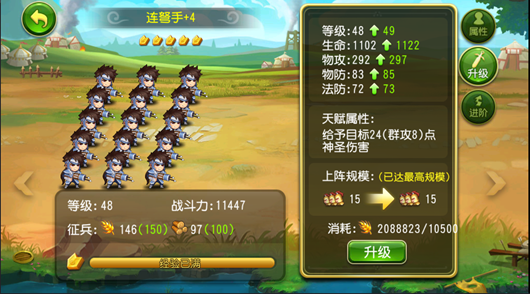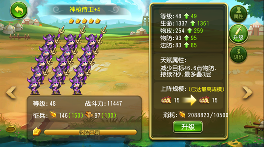 我们来看兵种的天赋属性,枪兵是减少目标物防,在我现在的等级下是46.6,叠加三层是减少139.8的物防。
