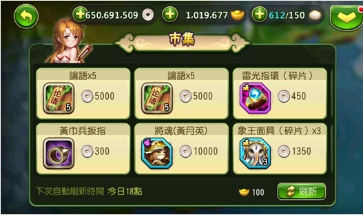 集市是无双兵团中一般的商店,这里的品质比较一般,但能满足早期玩家的发展需要,能买到常用的一些道具、装备碎片和武将将魂。在每天18点,会进行物品重置,也可以发给少量元宝进行重置。