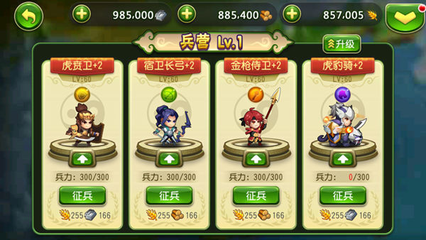兵营是《无双兵团》的主要创新部分,是小兵产出的基地,也是提升主公实力的重要途径。升级兵营能够提高小兵的生产速度。在无双兵团中,小兵可以升级和进阶,升级会消耗兵草,进进阶消耗兵魂。进阶到一定程度外貌也会改变,变得更加炫酷。小兵有两种作战形态,特性不同根据需要可以在战斗中切换。小兵阵亡后需要征兵,消耗资源,因此升级兵营十分重要,对于后期主公在游戏中征战四方有极大的帮助。