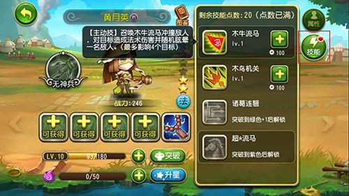 点击红框所示“技能”按钮,可查看武将技能。长按技能,可看到技能详细介绍。