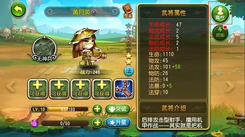 点击红框所示“属性”按钮,可查看武将属性和武将介绍。