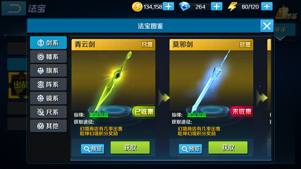 在图鉴中我们可以看到,全部的法宝有:剑系,幡系,旗系,阵系,镜系,阵系,镜系,尺系,其他(战神枪,神火轮,雷光锤),不同系别中的法宝也是有不同的品质的,品质越高的法宝也就越强。提升法宝的资质和等级也可以让法宝变得更强。法宝图鉴还可以查看法宝的收集情况,查看所有法宝外观、羁绊仙缘、获取方式和预览战斗技能效果。