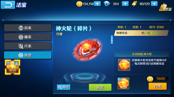 我们可以通过法宝碎片来合成新的法宝,然后消耗一定的材料来强化法宝,强化法宝可以提升法宝的主动技能和被动技能的属性。强化法宝需要的材料有:初级晶石和聚灵砂。碎片材料和强化材料可以通过挑战环境来获得;聚灵砂还可以通过分解神火轮及其碎片获得。