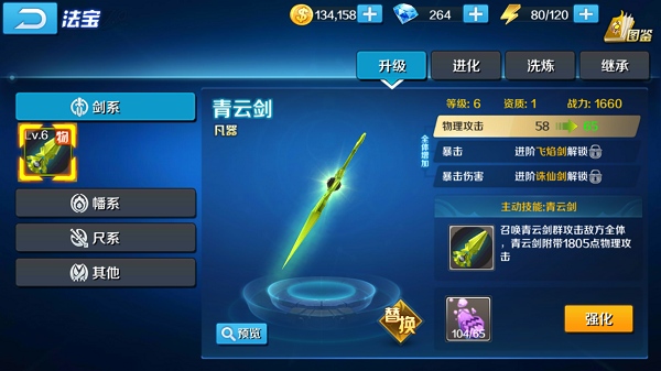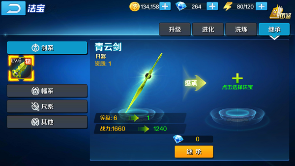 低等级的法宝可以继承高等级法宝的等级,不过这个操作需要花费一定钻石。