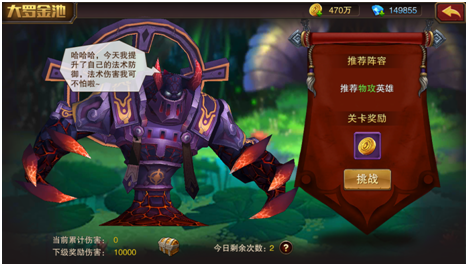 2、大罗金池的BOSS分为两种类型,一种是法术免疫BOSS,一种是物理免疫BOSS。需要根据BOSS的提示选择合适的英雄上阵,才能获得最大的收益。