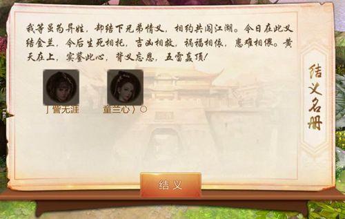 另外,结义后还能让新的小伙伴加入这个团体,在结拜的NPC处选择“桃园结义”—“接纳新人”即可,最多可以增加到8人,寻找你的兄弟,一起来闯荡江湖吧!
