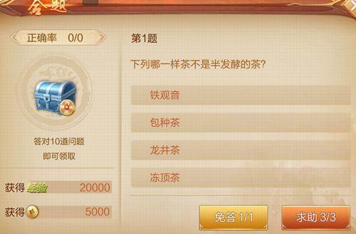玩家每答对一题,就能获得一次经验和刀币的奖励,题目的种类也五花八门,有日常生活类的,考验你4种茶哪种不是发酵茶,也有历史类的,问你以无字碑名扬天下的是谁,这时就考验玩家知识的累积了。