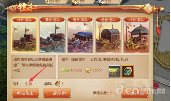 每日活动期间,到达洛阳坐标:133,88, 找到毕方亥,即可接取押镖任务,可以押韵护送镖车两次,每次可以免费刷新一次镖车的品级,绿色最弱,蓝色其次,紫色中档,橙色优秀,红色为最好品质,所以说一定要尽量的刷到高等级的镖车哦,如果没有刷新到满意的镖车,可以使用押镖令继续刷新,直到刷新到您喜欢的镖车为止,同样也可以劫掠他人的镖车三次,成功与否都是三次哦。