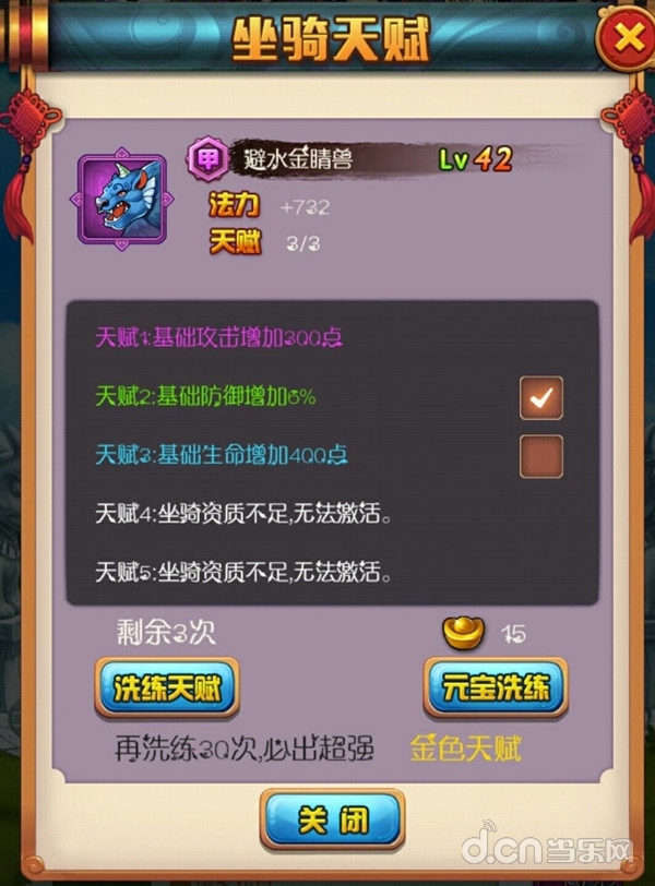 玩家每天有三次免费洗练坐骑天赋的机会,也可以花费元宝洗练。