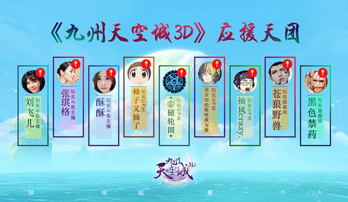 广大玩家和粉丝不仅可以欣赏王嘉尔演唱的唯美主题曲和深情的他,更有应援天团全面降临,海量惊喜承包你的视听体验。由知名插画师黑色禁药、苍狼野兽精心绘制的同人插画、极品霏的剧情长条漫画和念萦墨葵的精彩大作,将在各自的微博上发布,想要第一时间欣赏的玩家,不要错过各位大大们的微博哟。同时,由刘飞儿、张琪格、酥酥领衔的斗鱼女神主播天团将在今晚20:00-21:00,在“九州天空城”集体发起求爱活动,遇见有缘人,你就是下一个让主播心动的人。此外,还有柚子又抽了、抽风crazy等知名UP主,带来笑料十足的游戏解说、杂谈等视频直播,相信各位人气UP主的高能吐槽和神总结会为玩家带来奇妙无比的游戏体验。值得一提的是,应援天团的各位大大们,还结合了各自的优势,制作了一个超炫酷超搞笑的应援H5,玩家们可在官方微博@九州天空城3D一探究竟哟!