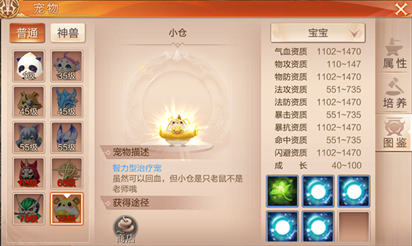 宠物除了普通攻击以外,也拥有自己的技能体系。普通宠物可以学习4个技能,而神宠则可以学习8个!