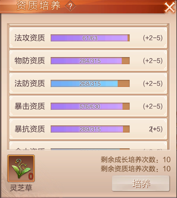 对宠物的某一个成长资质不满意怎么办?这时候就可以使用灵芝草有针对性的对某一项资质进行培养,注意哦!每个宠物只能培养十次!