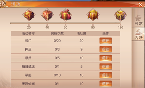 这些带有活跃字样的任务,除了原本的活动奖励以外,还会提供大量的活跃点数。活跃点数累积到一定数量后,就可以兑换活跃礼包啦!不过要小心,活跃值每天都会清空一次,所以兑换要趁早!