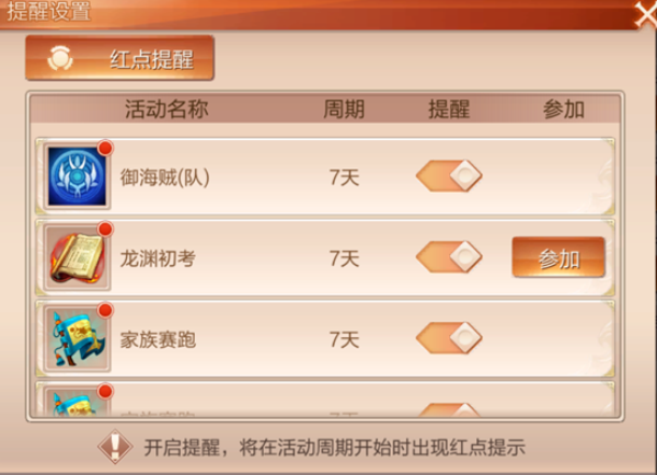 游戏提供了活动到时提醒功能,会通过小红点提示各位。有强迫症的同学这下再也不用担心自己会错过活动啦!