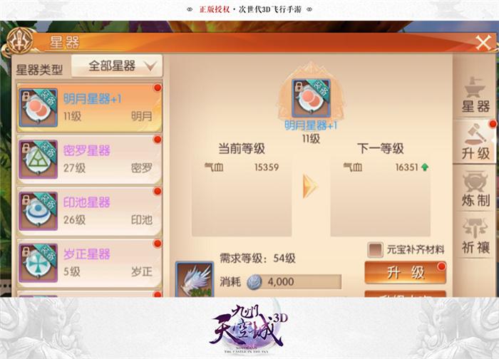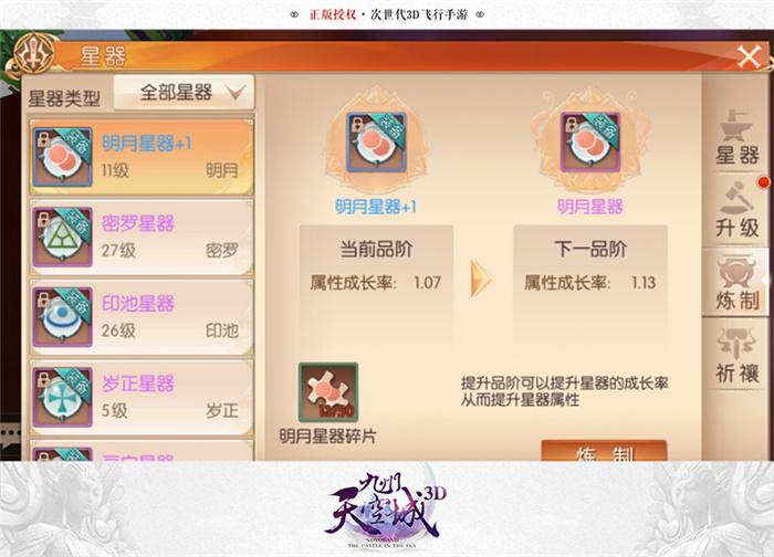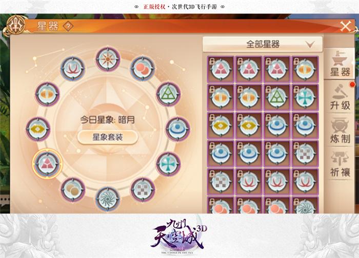 玩家可通过消耗“星翼”材料和银币,对星器的各项属性进行提升。同时,可消耗相同的星器碎片对星器进行炼制,全方位提升星器品阶,从而获得更多的属性加成。玩家每日可从祈禳获得星器、星器碎片以及星翼材料等珍稀物品。