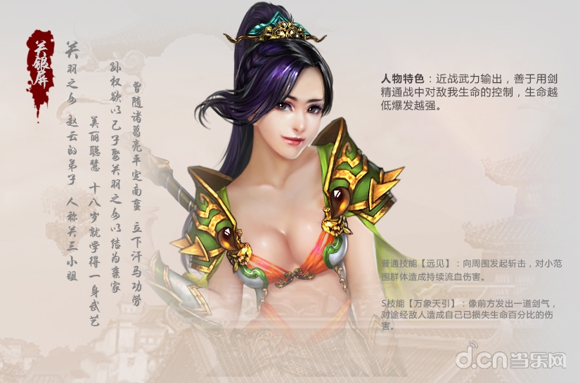 关羽之女、赵云的弟子,人称关三小姐;美丽聪慧,十八岁就学得一身武艺,孙权欲以己子娶关羽之女以结为亲家,不料被关羽“虎女安能配犬子乎”所拒。曾随诸葛亮平定南蛮,立下汗马功劳。