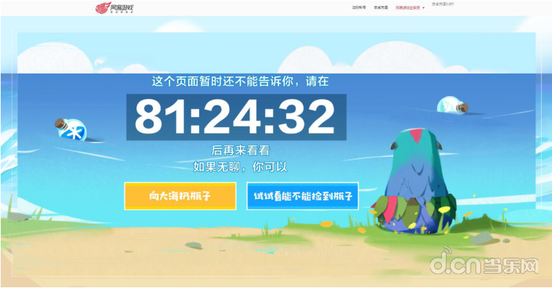 在清新的沙滩上,一个穿着树叶围裙的不明生物,背对屏幕面朝大海,似乎在咸咸的海风中眺望海天一色,海面上漂浮着两个圆形的玻璃漂流瓶。不明生物、大海、漂流瓶,应该就是这款未曝光游戏的关键信息,从这张图还有网易游戏域名的规律也可以推断,倒计时页面域名中的hd,很有可能是海岛的缩写。