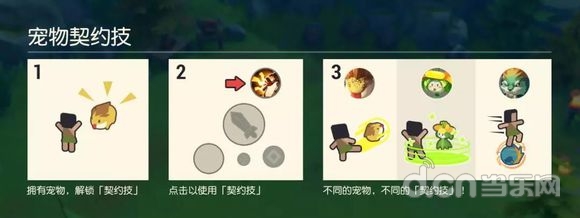 在战斗中,出战宠物会提供一个可手动释放的主人和宠物合体的契约技能。不同类型宠物,合体技能的效果完全不同,有伤害、嘲讽、回复、控制等多种效果。除了合体技能外,宠物在战斗中也可以使用自己的专属技能。