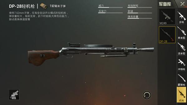机枪在游戏中十分少见,仅仅有两种,DP-28在地图中还可以搜索到,但M249却只在空投中出现。因为DP-28极强的稳定性极差,换子弹的速度也非常慢,而且仅有全自动开火模式,所以不被部分玩家所看好。