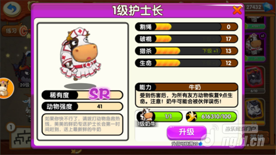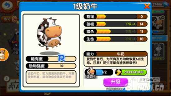 首先是R级动物奶牛——受到伤害可以会所有友方动物恢复6点生命,但是会被伙伴误伤。通过能力介绍,我们可以了解到,奶牛属于辅助型动物,而且关键时刻可以被自己的伙伴打中,保证其它伙伴的血量回复,完全是一个牺牲自己,成全他人的角色。