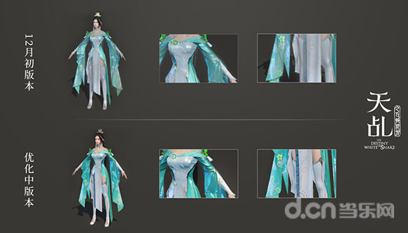 同时,时装在本次调优版本中较之12月初版本(以下简称12月版本),也有明显提升。丝绸的质感、纹路细节都大幅度改善,装饰花纹的细节随着清晰度的增强更显美观。同时,针对不同的光照角度,做了符合现实的反光和阴影处理,将真实度推向了极致。