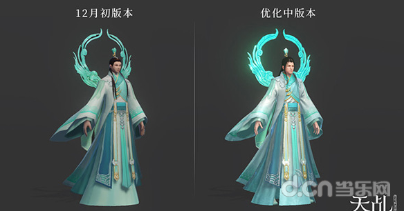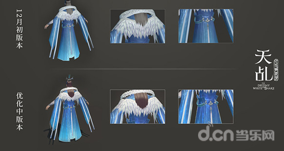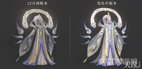 游戏的材质通常面临着这样一种瓶颈:装备或时装在游戏中由于光照不足显得暗淡,甚至产生纸片感。在12月版本中,昆仑背部的羽毛缺少层次感。在本次调优中,随着材质的不断提升,《天乩》手游突破了原本的材质局限——昆仑背部的羽毛片片分明,错落有致,立体感得到了充分的体现。