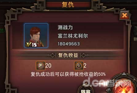 这时会发现消息中,出现了“去复仇”的按钮,点下他,就可以查看到抢劫者的信息,这时点击进入战斗,将会复仇抢劫者发生战斗,每次被抢劫后,只能在2小时内复仇,过时将不能复仇,而且在此期间,只能复仇一次,复仇成功后,将会得到被抢走收益的50%,如果复仇不幸失败了,也能获得一点奖励。