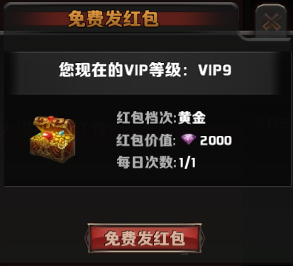 1、vip2等级以上的玩家,可以在公会中向其他玩家发放红包,每天有一次免费发放红包的机会,每个公会成员都可以开启一次,通过转盘获取各种奖励