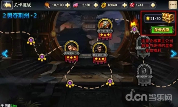 每一个章节和关卡都会有对应的奖励:宝石,进阶石,技能书甚至是装备和橙色武将碎片,奖励可谓非常丰富,正因如此,所有主公都能不可以体力去挑战这个守关记录,而守住关卡的主公,更加会成为全服所有人挑战和膜拜的对象!各位对自己实力有自信的主公,记得每天来争抢这个关卡阵地,让众人膜拜吧!
