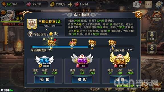 军团贡献可以通过军团捐献获得,捐献根据初级、中级、高级需要耗费金币/钻石。