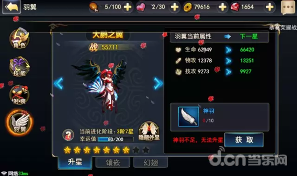 羽翼除了华丽之外,当然也会有强大的战斗力加成。主公需要去商店买神羽强化,而每次强化都会有一定概率失败,但是不要紧,每次在强化的同时,主公都能积累到幸运值,当幸运值满的状态下,本次强化就一定会成功。
