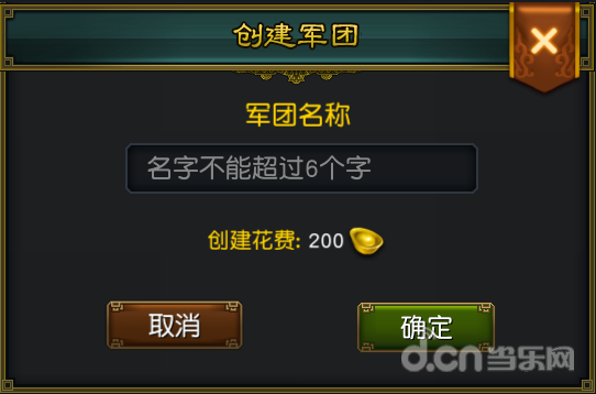 2.点击“创建军团”会弹出创建军团界面,只要名称符合系统要求,花费200元宝即可创建一个属于自己的军团。