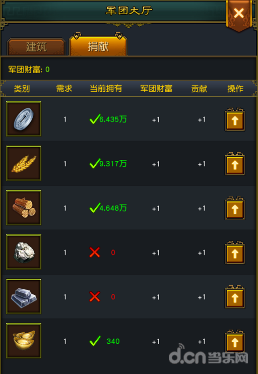通过军团大厅的捐献页面,可以将自己多余的物资捐献给军团,用以增加军团财富,促进本军团的发展。军团资金可以用于提升军团建筑等级和升级军团技能等级,而捐献后获得的个人贡献可以用于学习军团科技。