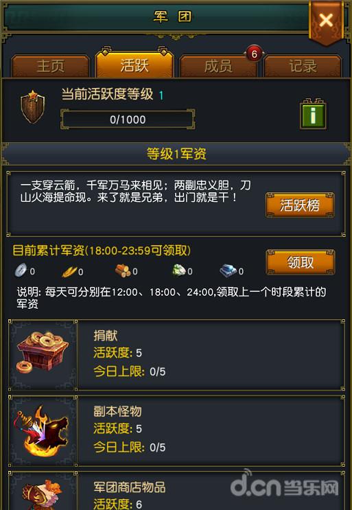 4.根据军团的活跃等级,加入军团达到24小时以上的军团成员可以领取当前活跃度等级对应的军资。