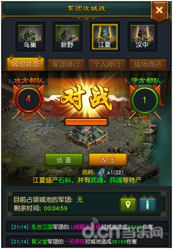 2.每座城池都会有一位名将驻守,只有所有人齐心合力将其击败才能进行城池争夺。对名将进行最后一击的军团享有该城池的所有权,其他军团只有将此军团的驻守军队全部打败后才能抢夺到该座城池的所有权。
