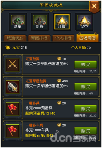 5.系统还贴心的为各位玩家准备了战场商店,只有在攻城战开始时才会开放。如果觉得攻城有困难,可以直接在战场商店中购买各种BUFF以及一键补兵。