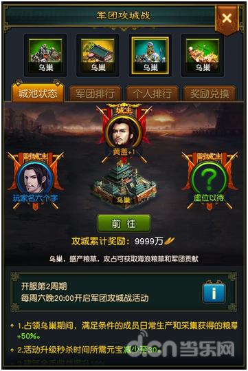 1.地图上总共有四座城池可供军团攻打,分别为乌巢(盛产粮草)、新野(盛产木材)、汉中(盛产石料)、江夏(盛产铁矿),每轮活动只开放其中的两座城池参与争夺战。