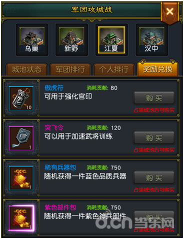 3.每个城池盛产的物资不同,攻打城池可以获得大量的对应资源。占领城池的军团,不仅能得到资源BUFF加成,还能在城中购买特产物资,甚至有机会购买独一无二的绝世神兵部件。