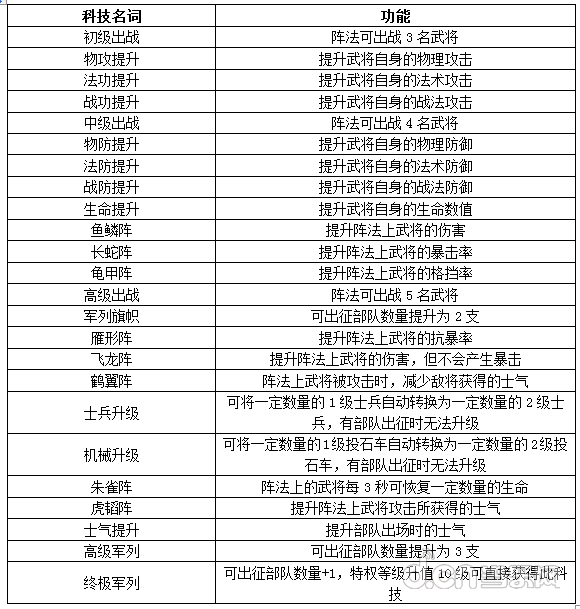 1.此处的科技均与出阵战斗相关,具体如下: