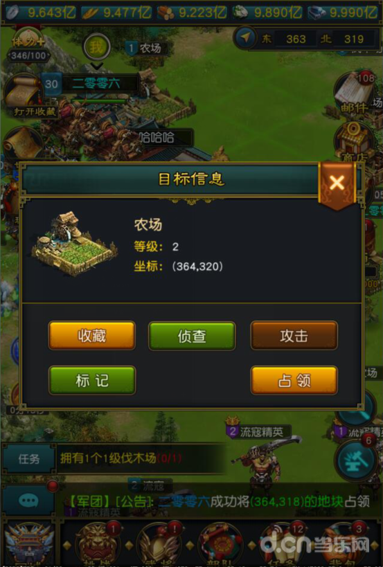 1.军团长或者副团长对地图中的空地或者矿点地块进行标记后,军团中所有成员可以出兵占领,将其纳为本军团的领土使用,矿点也可通过占领归入到己方领土内。作为军团长和副团长的特权,可以不通过标记,直接出兵占领。