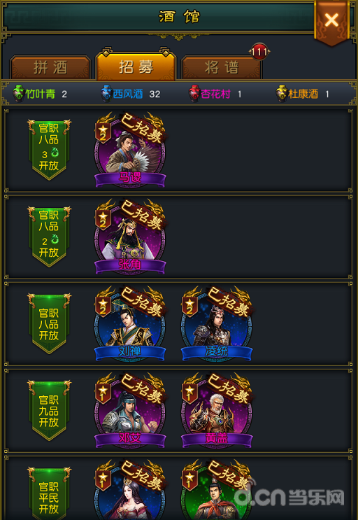 4.通过消耗一定数量不同品质的酒水来招募不同品质星级的武将。