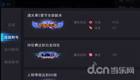 成就称号:人物达成一定成就可以获得成就称号。成就称号永久获得,其属性也将永久加成到人物属性中。但同一系列的高级称号属性覆盖低级称号。