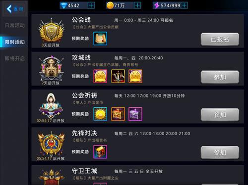 活动时间内,报名成功的公会成员,可以点击游戏主界面“活动”图标选择“限时活动”中的“公会战”按钮,进入公会战战场。也可以与洛亚王城NPC公会战负责人对话进入战场。
