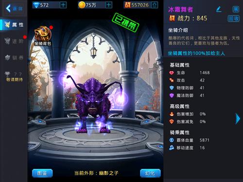坐骑驯养:通过消耗驯养指南、金币或钻石可以驯养坐骑。驯养将增加坐骑的生命、攻击、物理防御、魔法防御。
