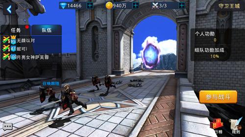 组队成功后,队长可以点击主界面右上角“活动”图标选择限时活动中的“守卫王城”,将全队带至洛亚王城地图与“募兵官海勒”对话,即可参与活动。