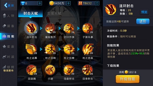 在战场上,赏金猎人的有着强大到足以清扫前方的攻击手段以及进退自如的行动方式。【连环射击】、【魔能轰炸】、【封印 】、【**风暴】是四个自动连续进阶技能,连续一套可以对自己面前的敌人造成巨大的伤害。同时**风暴技能还可以在对敌人造成伤害的同时产生击退效果,以此拉开双方之间的距离;并且妮可还有着在主动拉开与敌人之间距离的同时进行攻击或反击的【回身射击】和【隐蔽射击】这两个技能。更增强了她的自保能力,在受到攻击陷入被动时尽快恢复到战斗状态。