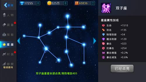 点击人物面板,可以打开星座系统界面。目前共有12个星座,每个星座由若干星星组成。