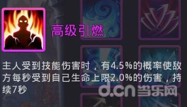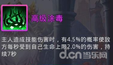 高级涂毒、高级引燃、高级撕裂:涂毒、引燃效果类似,攻击或被攻击有几率对对方造成持续伤害,伤害量是基于你自己的血量的,你有10万血,就能对对方造成2000每秒的持续伤害;