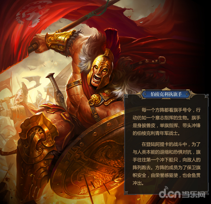 每一个方阵都看旗手号令,行动彷如一个意志指挥的生物。旗手是身披兽皮,举旗指挥、带头冲锋的伯棱克利青年军战士。